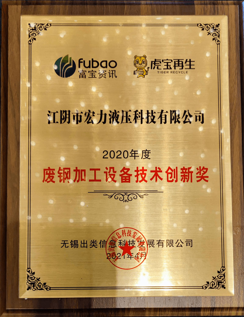 宏力科技自2018.1.18创立以来,先后获得ISO国际质量体系认证、欧盟CE认证3项、国家知识产权局颁发的核心专利15项、江苏省民营科技企业、江苏省科技型中小企业、产学研合作基地、再生资源装备工程技术研究中心、废钢加工设备服务模范企业、废钢加工设备技术创新奖、科技创新奖等几十项殊荣。